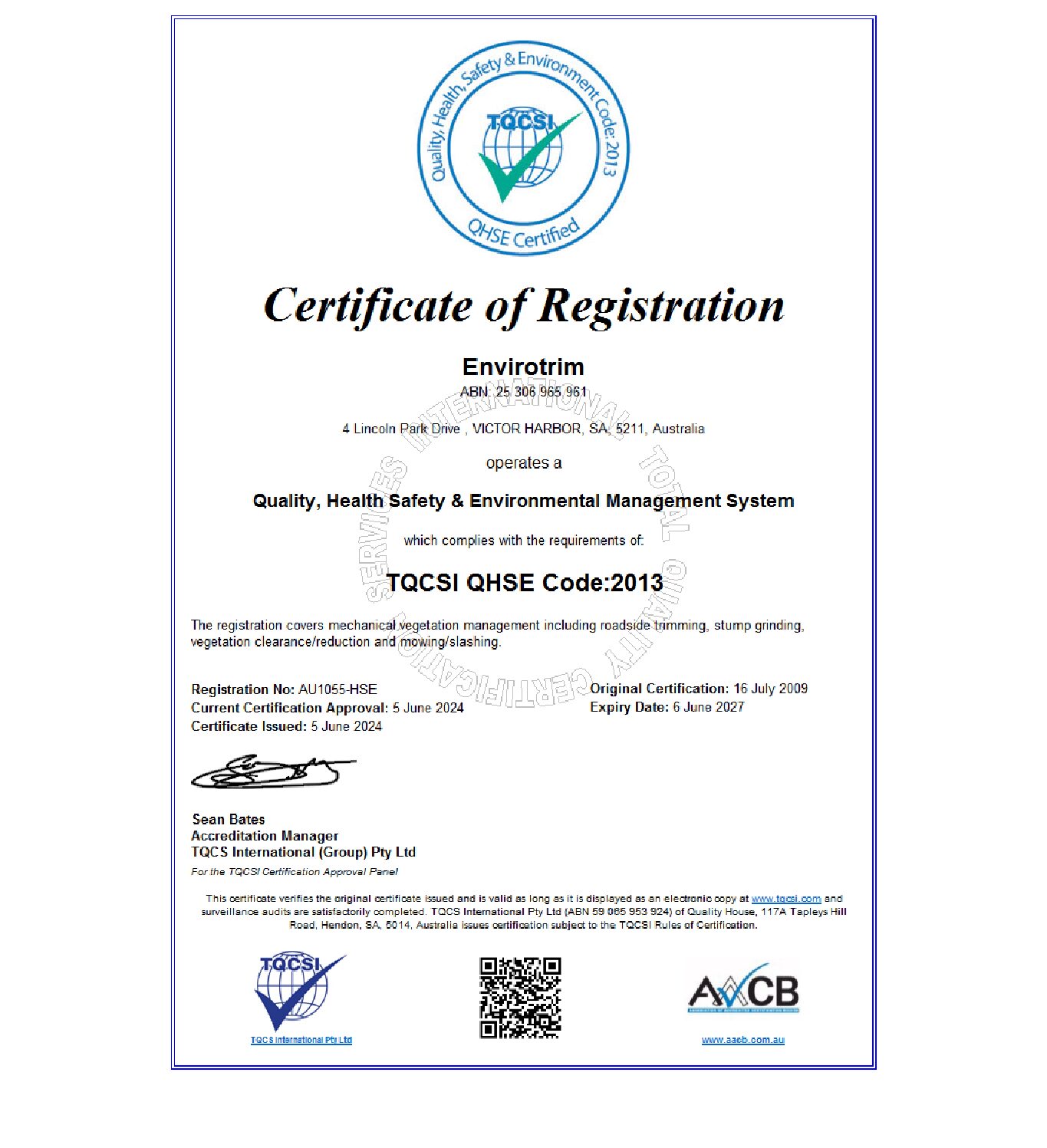 Envirotrim is fully certified. Businesses who are certified against the QHSE Code can demonstrate to their customers an ability to identify, analyse and manage quality, workplace safety and environmental impacts under a management system which is audited and certified by an independent, third party certification body.